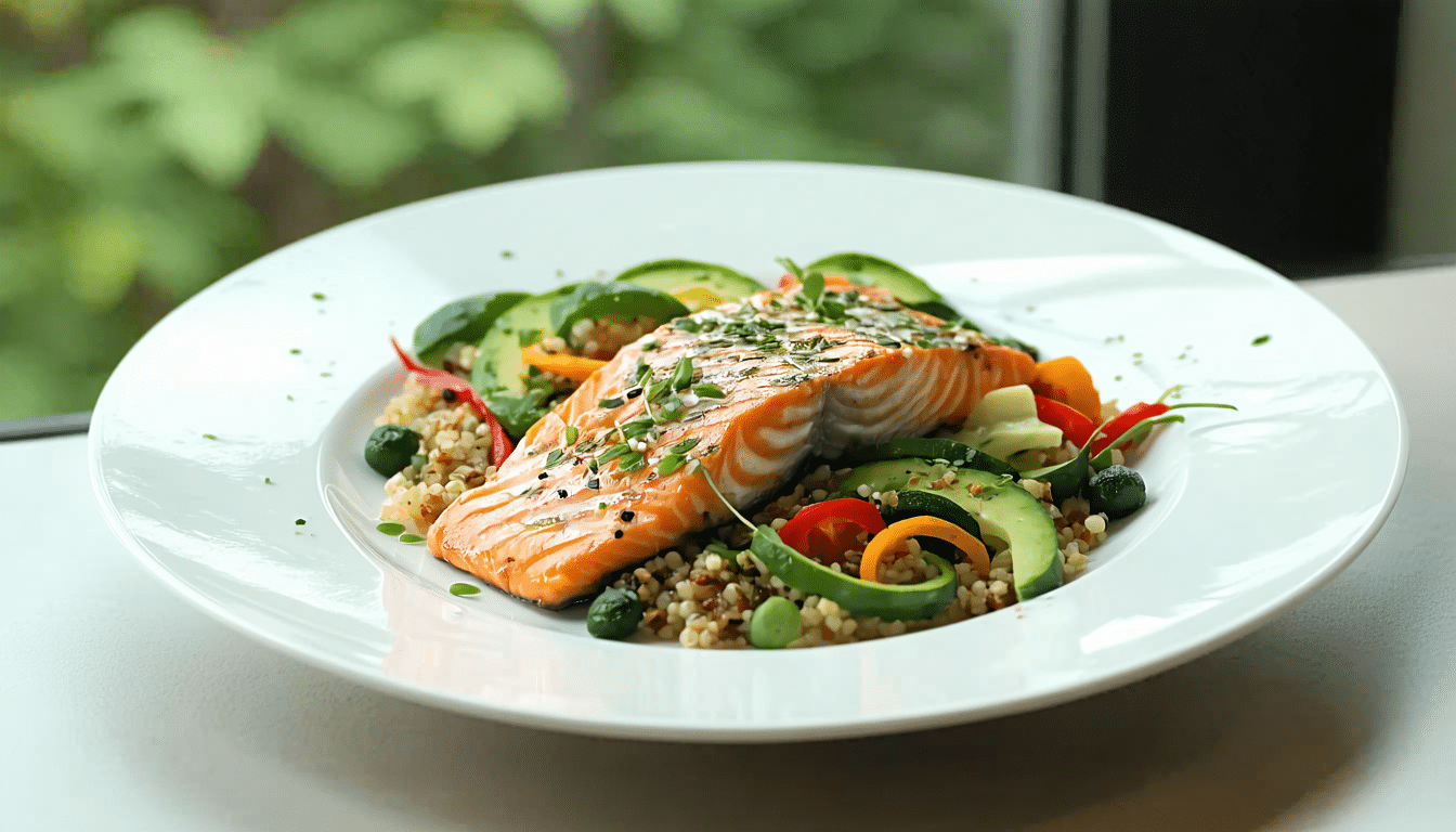 | Dîner | Soupe maison, saumon grillé, quinoa, fruit frais | Oméga-3, fibres, antioxydants |